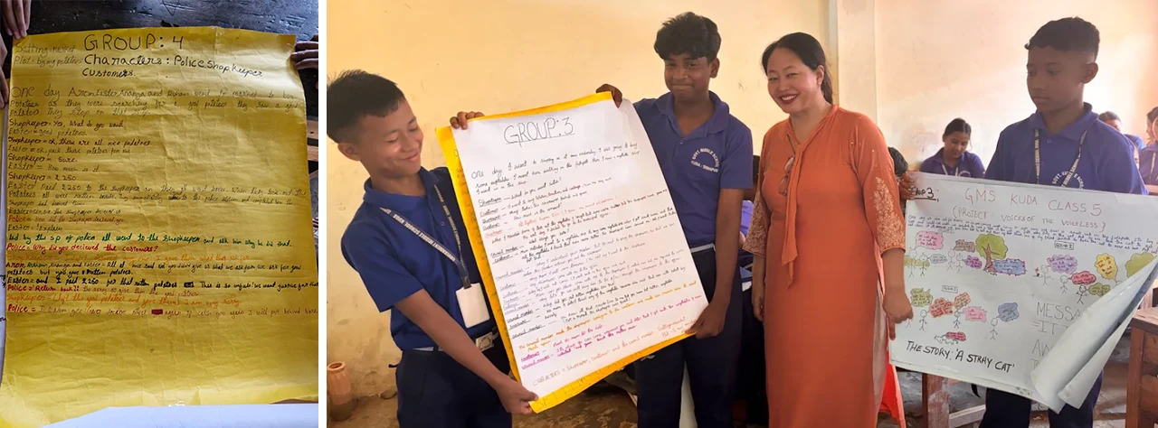 In one classroom, students read a story in their English textbook and were then asked to write a new one using the same characters. They planned it together, wrote it on chart paper, and acted it out right there in class.
